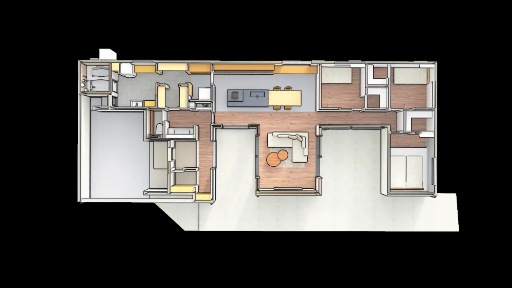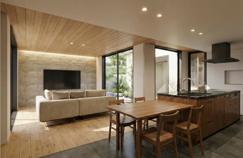 「コの字型」の利点を最大限に活かした、非常に完成度の高い間取りは、中庭を介して光と風を家全体に採り込みつつ、外部からの視線を遮る圧倒的な開放感と、効率的な家事ラク動線による暮らしやすさを高い次元で両立させています。
