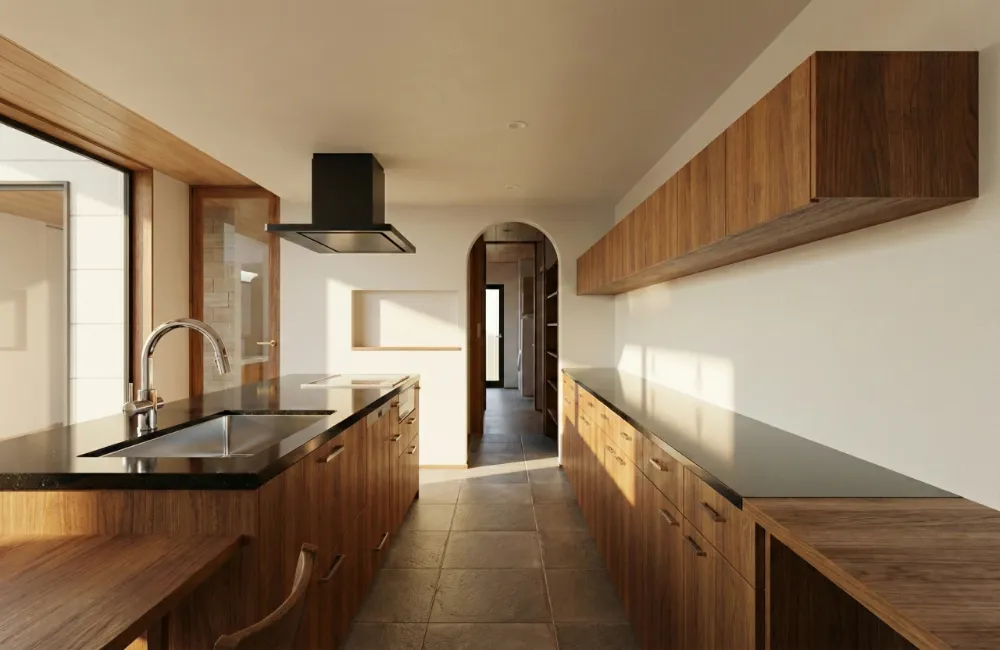無垢材を使った高性能キッチン。 自動洗浄付きレンジフードやフロントオープン食洗機搭載。