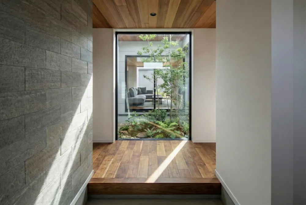 玄関正面の窓が中庭の緑を絵画のように切り取り、リビングまで視線を抜くことで、住まいに圧倒的な奥行きと開放感を与えます。