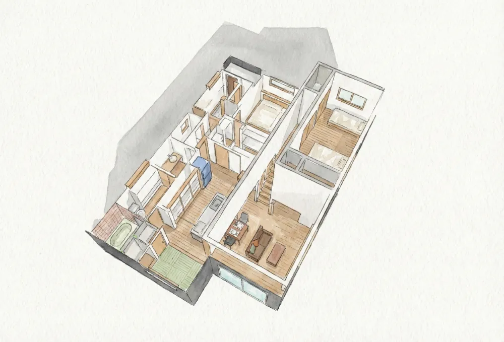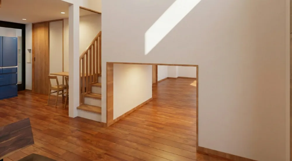 縦の空間を巧みに活かした1.5階建ての間取りです。高天井で開放的なリビングと、大容量の床下収納を両立。家族が集うLDKと、段差で自然に分けたプライベート空間が、心地よい距離感を生み出します。