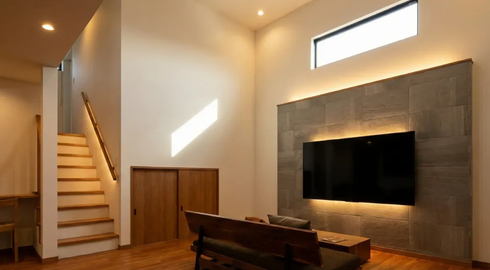 縦の空間を有効活用した、天井が高く開放感あふれるリビング。自然光が心地よく広がり、家族みんなでのびのびとくつろげます。